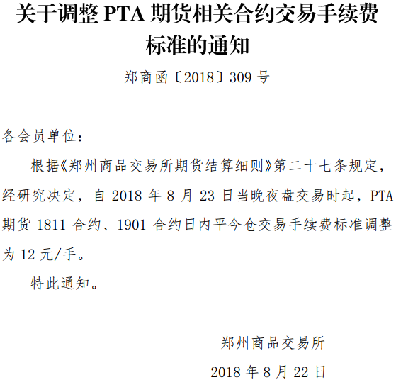 8月22日,鄭商所官方網(wǎng)站發(fā)布消息稱,根據(jù)《鄭州商品交易所期貨結(jié)算細則》第二十七條規(guī)定,經(jīng)研究決定,自2018年8月23日當晚夜盤交易時起,PTA期貨1811合約、1901合約日內(nèi)平今倉交易手續(xù)費標準調(diào)整為12元/手。