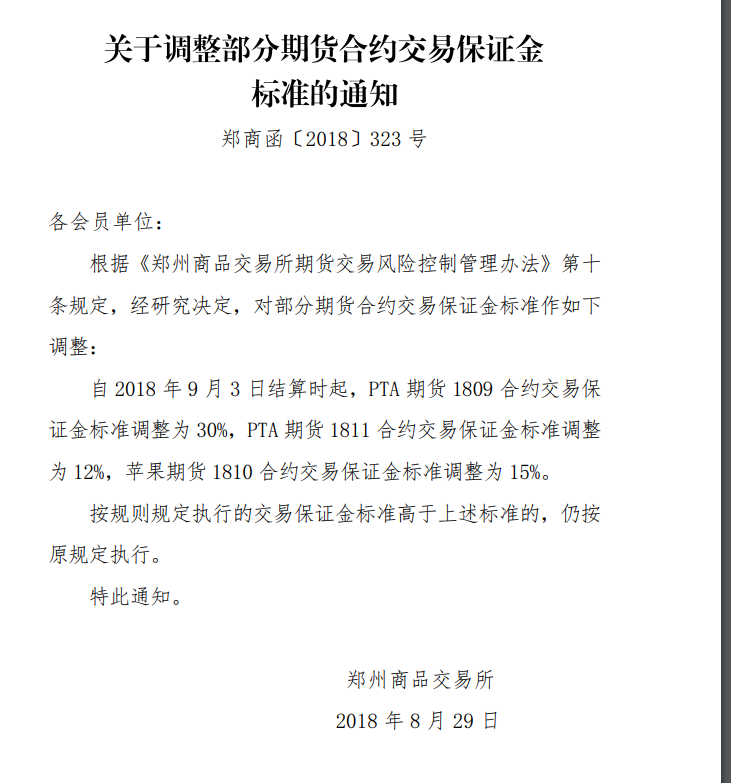 8月29日,鄭商所官方網(wǎng)站發(fā)布消息稱,自2018年9月3日結(jié)算時(shí)起,PTA期貨1809合約交易保證金標(biāo)準(zhǔn)調(diào)整為30%,PTA期貨1811合約交易保證金標(biāo)準(zhǔn)調(diào)整為12%。