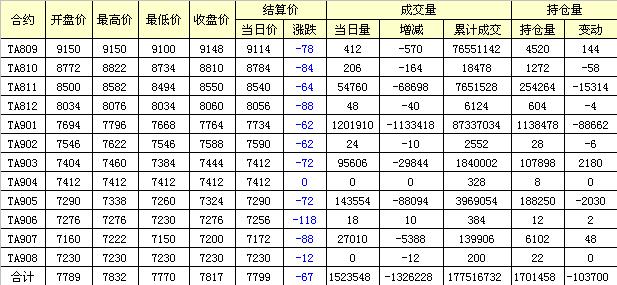 主力TA811合約當日交易走勢