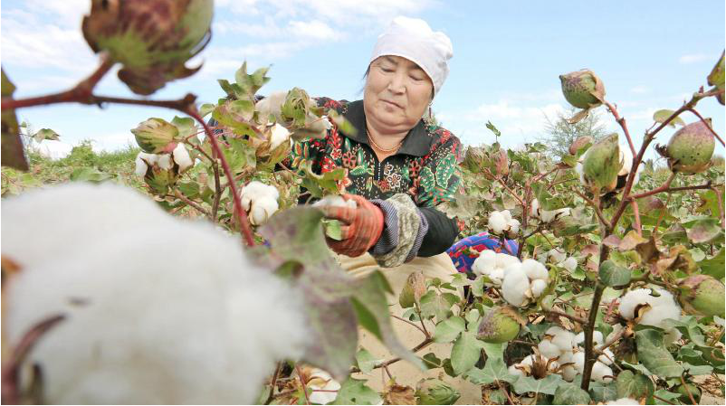 9月13日,沙雅縣海樓鎮(zhèn)塔勒克巴格村村民正在棉花地里采摘棉花。