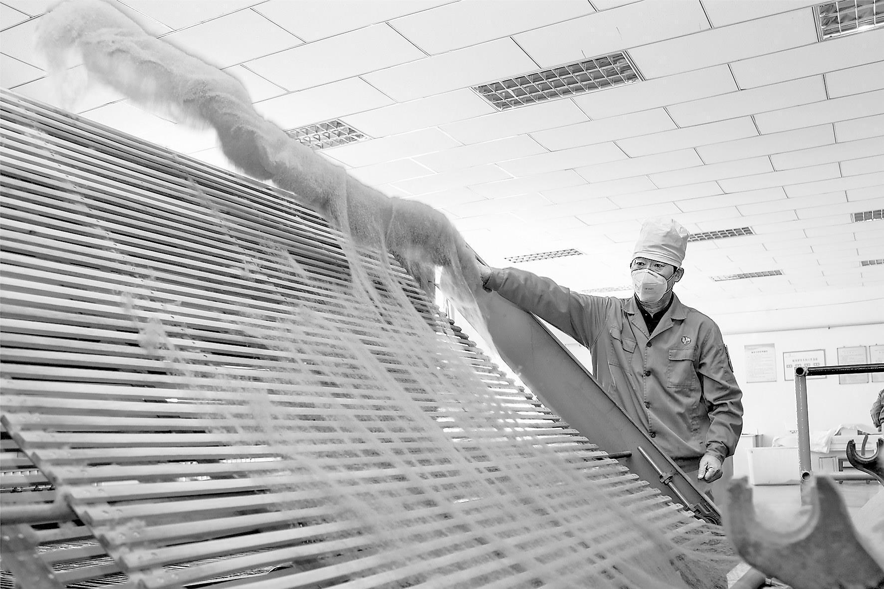 9月14日,在新疆哈巴河縣雅居床服有限責任公司,工人在加工駝絨被。