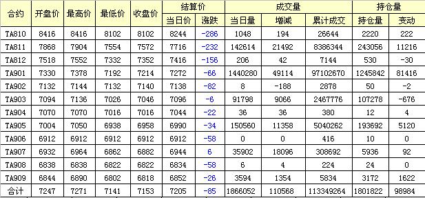 主力TA811合約當日交易走勢