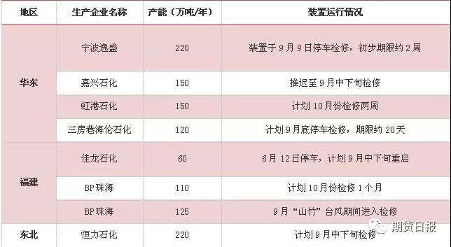 雖存在需求疲軟,但進入9月中旬后,由于PTA大廠陸續(xù)進入檢修狀態(tài),因此供應上壓力也逐漸緩解。由下表中可以看出,目前已進入檢修的逸盛、BP珠海涉及的產(chǎn)能即達到近30萬噸/月,而如果在節(jié)后其他檢修計劃均得以兌現(xiàn),則將涉及750萬噸/年產(chǎn)能,即62.5萬噸/月產(chǎn)能減少。雖有部分檢修計劃不足一月或者可能錯峰實行,但仍是大量供應減少。