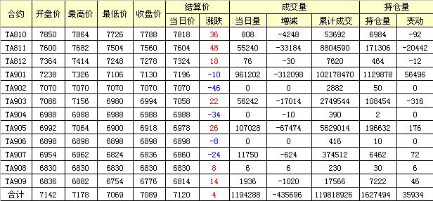 主力TA811合約當日交易走勢