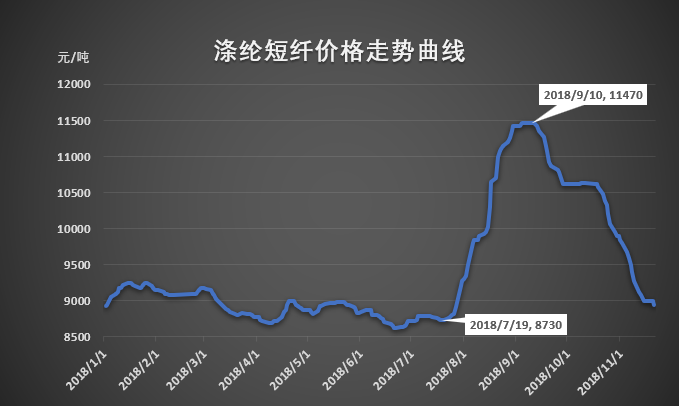 然而國際油價(jià)在10月3日盤中觸及高位之后便開始急轉(zhuǎn)直下,跌勢(shì)持續(xù)1月有余,在11月13日大幅下跌之后開始適度反彈,此時(shí)滌綸短纖、純滌紗此次回落的時(shí)間和力度也基本達(dá)到多數(shù)業(yè)者心理預(yù)期,第二波采購又再度產(chǎn)生,但因鑒于第一波利潤受損,第二波階段性采購量明顯不足,但這已在一定程度上暫時(shí)緩解滌綸短纖、純滌紗的部分庫存壓力,產(chǎn)品價(jià)格可以暫時(shí)企穩(wěn)甚至出現(xiàn)輕微上揚(yáng)。