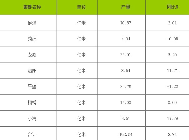 據(jù)各集群地區(qū)統(tǒng)計,2018年1-9月盛澤、秀洲、龍湖、泗陽、平望、柯橋、大豐小海七地化纖長絲織物產(chǎn)量累計162.64億米,同比增長2.94%。盛澤、秀洲、平望等地限產(chǎn)升級成果明顯,泗陽、小海等新興產(chǎn)業(yè)集群陸續(xù)投產(chǎn),整體而言,全國化纖長絲織物產(chǎn)量保持平穩(wěn)增長態(tài)勢。