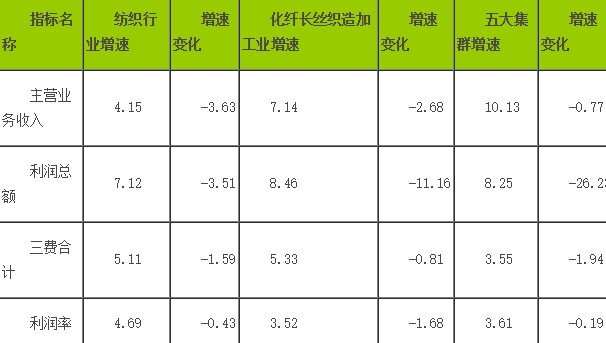 相關(guān)數(shù)據(jù)顯示,我國紡織業(yè)、化纖長絲織造加工業(yè)以及長絲織造五大集群(盛澤、秀洲、泗陽、平望、柯橋)的經(jīng)濟指標運行相對平穩(wěn),均保持正增長,但增速較去年同期均出現(xiàn)不同程度的下滑。