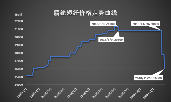 縱觀整個2018年,腈綸行業(yè)運行不佳,雖5-7月行業(yè)開工階段性提升至8成以上,然而進入9月后,原料丙烯腈價格拉漲至8年來高點,腈綸高價銷售阻力持續(xù),銷售旺季始終無體現(xiàn),廠家裝置負荷基本維持5成附近。雖10月原料跌勢已顯,但腈綸價格僵持盤整。至11月,市場傳聞腈綸價格下滑3000-5000元/噸,然而成交重心暫無觸及下游心理預(yù)期價位,交投氣氛持續(xù)低迷。
