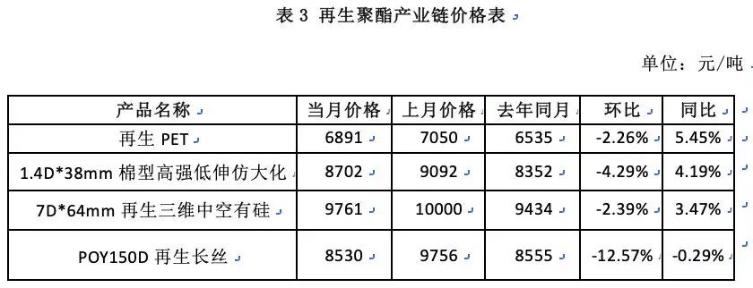 本月,再生聚酯4個產(chǎn)品均有下調(diào)。再生PET瓶片弱勢下行,實際成交平平;再生普纖主流行情持續(xù)下跌,局部地區(qū)價格隨之下調(diào);再生中空主流行情弱勢下滑,局部地區(qū)價格疲軟跌價;本月再生長絲行情一路下跌。預(yù)計再生瓶片趨勢依舊向下,但貨源緊張在一定程度上限制跌幅;再生普纖市場價或繼續(xù)疲軟,幅度有限;再生中空市場價或有下滑可能,幅度較窄;再生長絲下月依舊偏弱運行。