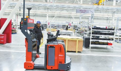 在經(jīng)開區(qū)(頭屯河區(qū))卓朗新疆紡紗機(jī)械智能工廠,自動導(dǎo)引運(yùn)輸車AGV機(jī)器人前往預(yù)定地點(diǎn)運(yùn)送設(shè)備。