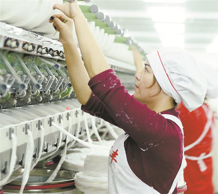 2月11日,來自一師十一團(tuán)的熱米拉·吐松在阿拉爾市新疆新聚豐特種紗業(yè)有限公司紡紗車間操作。