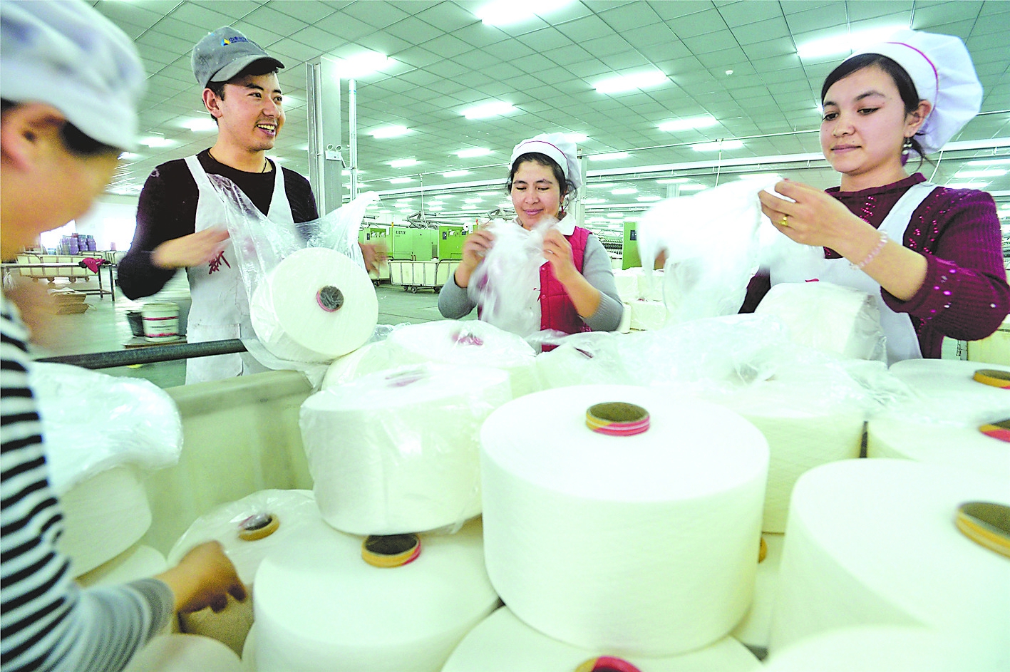 2月11日,來自于田縣的阿米娜·麥提庫爾班(右一)和同事在阿拉爾市工業(yè)園區(qū)的新疆新聚豐特種紗業(yè)有限公司工作。