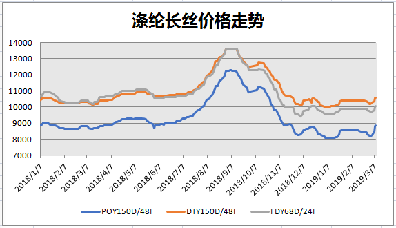 陽(yáng)春三月,滌綸長(zhǎng)絲行情止跌反彈。截至3月7日,常規(guī)POY150D/48F主流價(jià)位8500-9000元/噸,較2月末上漲4.8%,比年內(nèi)低點(diǎn)上漲8.0%。制造業(yè)增值稅下調(diào),商品市場(chǎng)整體表現(xiàn)強(qiáng)勢(shì)。再加上,PTA檢修動(dòng)態(tài)增多,推動(dòng)期貨及現(xiàn)貨價(jià)格強(qiáng)勁上漲。與此同時(shí),MEG行情同步跟漲。上游原料大幅上漲,有效刺激加彈和織造工廠采購(gòu)積極性,聚酯工廠產(chǎn)銷數(shù)據(jù)普遍放量,滌綸長(zhǎng)絲價(jià)格連續(xù)上漲,單日漲幅擴(kuò)大至200-300元/噸。