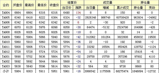 主力TA905合約當日交易走勢