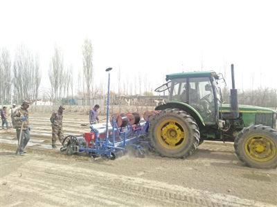 3月31日,在阿瓦提縣塔木托格拉克鎮(zhèn)玉斯屯克阿熱勒村一片農(nóng)田里,大型播種機正在播種棉花。時下氣溫回升,阿瓦提縣塔木托格拉克鎮(zhèn)不少棉農(nóng)搶抓農(nóng)時,播種棉花。