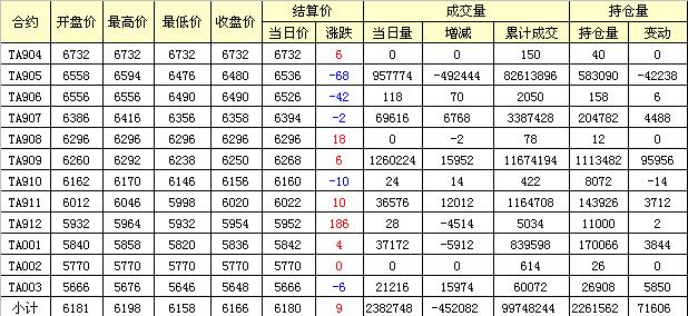 主力TA905合約當日交易走勢