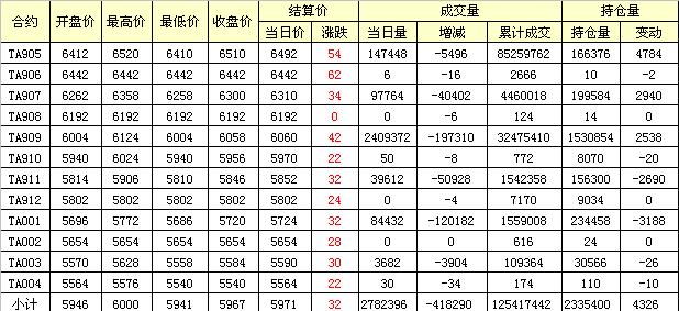 主力TA905合約當日交易走勢