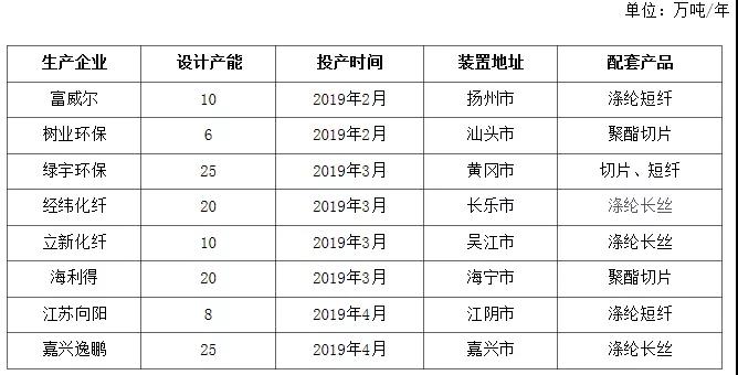 2019年1-4月中國聚酯新增產(chǎn)能合計124萬噸。期間共計8套聚酯新裝置順利投產(chǎn),新產(chǎn)能配套產(chǎn)品主要集中于聚酯切片、滌綸長絲、滌綸短纖三大領域。具體包括:富威爾10萬噸滌綸短纖、樹業(yè)環(huán)保6萬噸聚酯切片,綠宇環(huán)保25萬噸聚酯切片及滌綸短纖、經(jīng)緯化纖20萬噸滌綸長絲、立新化纖10萬噸滌綸長絲、海利得20萬噸聚酯切片、江蘇向陽8萬噸滌綸短纖、嘉興逸鵬25萬噸滌綸長絲。