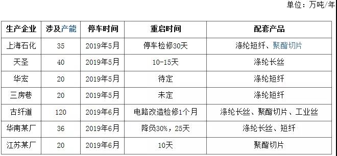 表2 2019年5-6月聚酯裝置檢修或減產(chǎn)情況