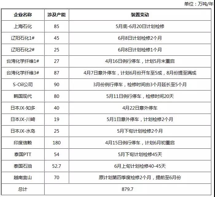 第2季度亞洲PX裝置變動(dòng)表