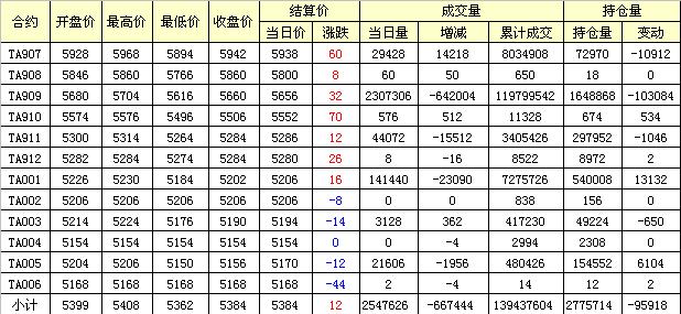 主力TA909合約當日交易走勢