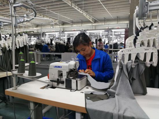 “我來這個公司1年多,現(xiàn)在每個月工資2700多元,自己留點(diǎn)生活費(fèi),其他的都寄給家里。這個企業(yè)環(huán)境特別好,我在這里學(xué)習(xí)國家通用語言和做服裝的整套工序,目前我想長期在這里工作,如果將來離開企業(yè),我想自己開一家服裝店?!八f。
