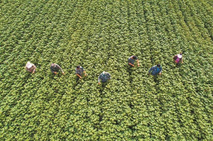 圖為7月9日,在二師三○團棉田里,群眾正在為棉花打頂。