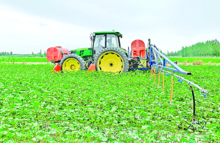 7月22日,在阿瓦提縣塔木托格拉克鎮(zhèn)托萬克阿熱勒村棉田里,棉農(nóng)正使用機(jī)械噴灑農(nóng)藥預(yù)防病蟲害,為棉花增產(chǎn)增收奠定基礎(chǔ)。