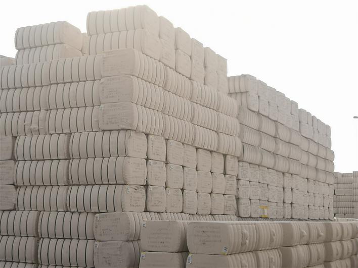 ▲銀力集團庫存區(qū)的皮棉按規(guī)定碼放有序