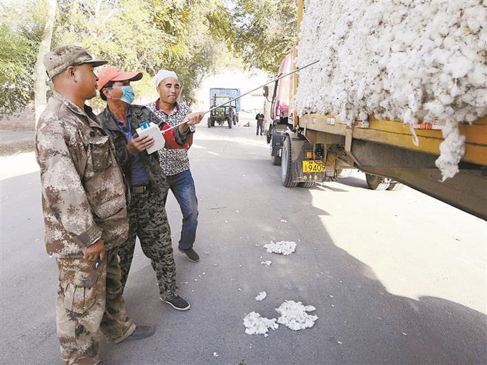 棉檢人員、種植戶、連隊“兩委”成員三方共同進(jìn)行棉花含水率檢測