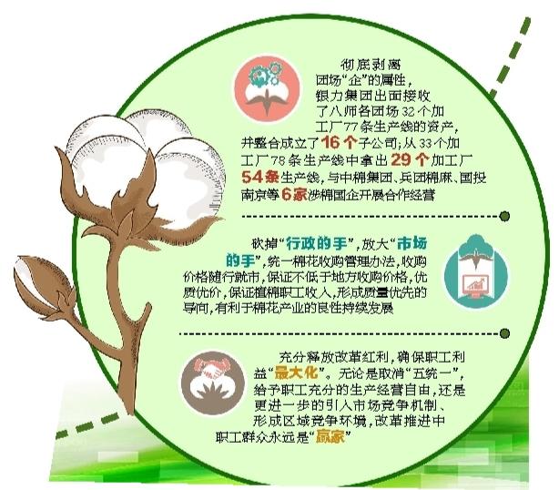 在深化團場綜合配套改革過程中,八師石河子市將13個植棉團場所屬的32個棉花加工廠收歸棉花龍頭企業(yè)銀力集團,并拿出2/3以上的生產(chǎn)線與外來企業(yè)合作經(jīng)營,引入市場競爭,采用“插花式”布局,打破棉花收購企業(yè)一家獨大的局面,實現(xiàn)職工利益最大化。