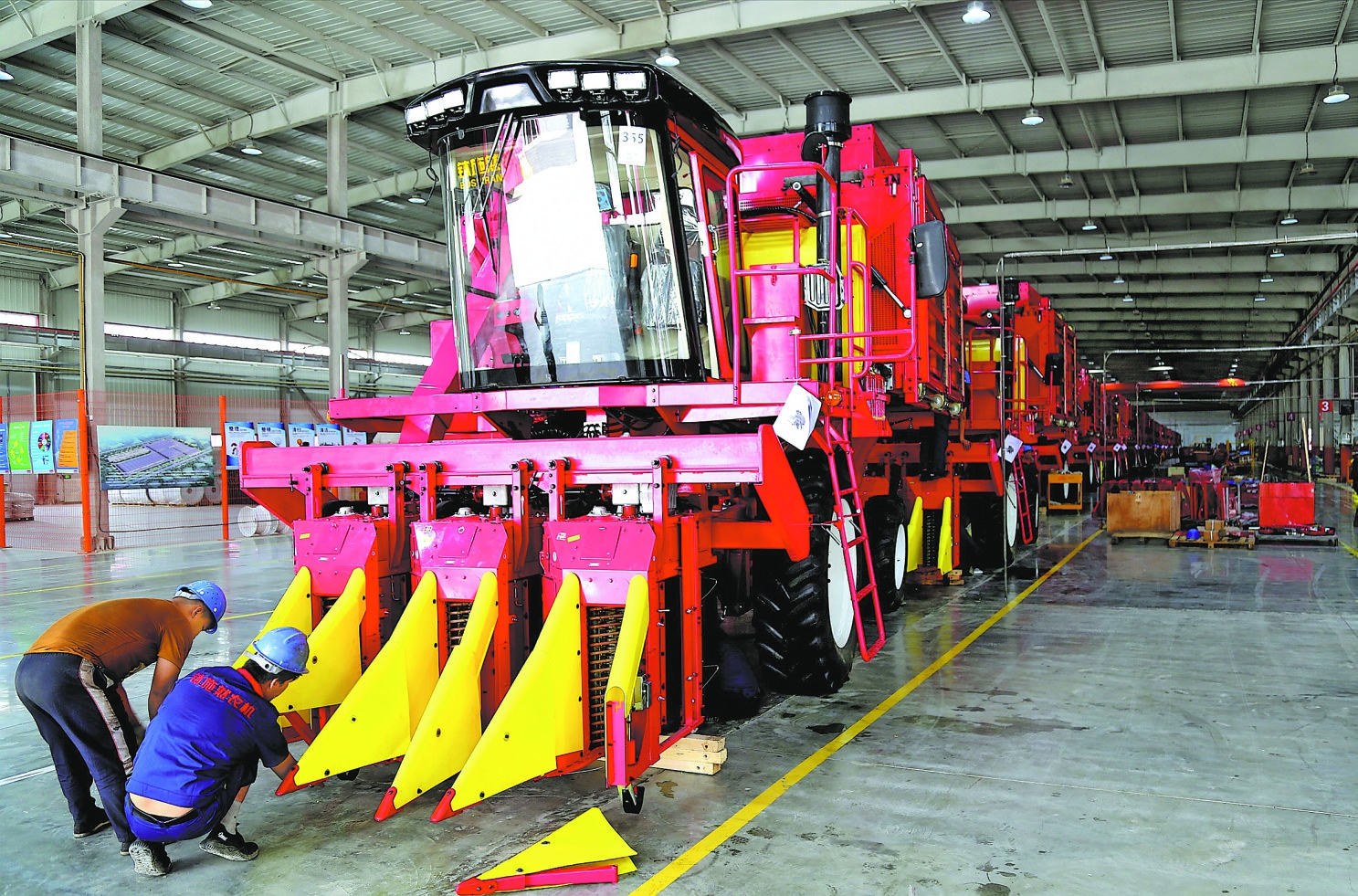 在沙雅縣缽施然智能農(nóng)機(jī)有限公司的生產(chǎn)車間里,工人們在為即將出廠的采棉機(jī)做最后的組裝。公司今年采棉機(jī)訂單達(dá)到460臺,產(chǎn)銷兩旺。