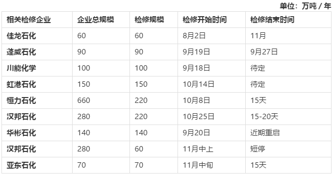 近期PTA裝置檢修計劃