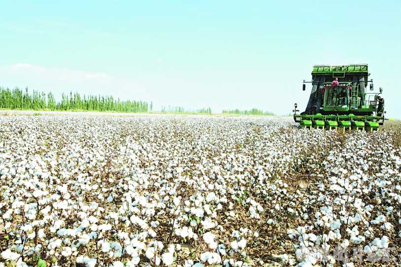 10月18日,大型采棉機在庫車縣二八臺鎮(zhèn)闊什阿瓦提村棉田里采收棉花。眼下該縣181.4萬畝棉花陸續(xù)進入采收期,村民們抓緊晴好天氣積極采收,確保豐產(chǎn)豐收。