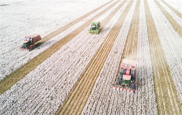 10月21日,大型采棉機(jī)在三師四十九團(tuán)三連棉花地里采收棉花。三師加快實(shí)施棉花質(zhì)量提升工程,提升機(jī)械化水平,提高職工種植棉花的積極性。今年,三師種植棉花110.4萬(wàn)畝,籽棉單產(chǎn)按400公斤計(jì)算,機(jī)采較人工采摘每畝可節(jié)省成本600元左右,同時(shí)大大縮短采收時(shí)間。