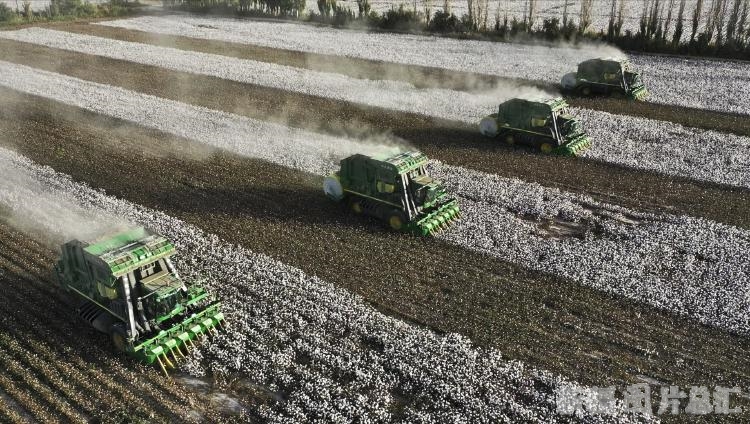 11月2日,采棉機(jī)在尉犁縣興平鄉(xiāng)統(tǒng)其克村棉田采收棉花。今年該縣102.87萬(wàn)畝棉花獲得豐收,其中機(jī)采棉99.47萬(wàn)畝,目前棉花采收工作已進(jìn)入尾聲。