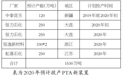 而到2020年,預(yù)計PX將繼續(xù)投產(chǎn),包括浙石化一期200萬噸、山東東營威聯(lián)100萬噸、沙特JAZAN85萬噸,合計約385萬噸裝置。PTA在2020年投產(chǎn)壓力更加明顯。