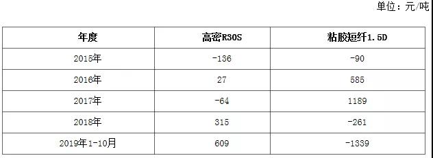 2015-2019年粘膠短纖、人棉紗行業(yè)平均利潤(rùn)對(duì)比表