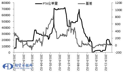 由于成本抬升,上游PX價格表現(xiàn)相對堅挺,韓國FOB價格穩(wěn)定763美元/噸附近,所以PTA成本端后期穩(wěn)定或小幅抬升概率較大。在這一判斷下,如果PTA價格企穩(wěn)或下跌,企業(yè)加工費(fèi)會進(jìn)一步壓縮,虧損則會進(jìn)一步擴(kuò)大,這將迫使企業(yè)停車或限產(chǎn)保價。筆者由此認(rèn)為,考慮到加工費(fèi)較低及成本相對穩(wěn)定,PTA盤面價格或出現(xiàn)反彈,以此修復(fù)當(dāng)前過低加工費(fèi)。不僅如此,近期PTA期貨走勢弱于現(xiàn)貨,基差擴(kuò)大,注冊倉單明顯下降。隨著倉單下降及部分基差交易頭寸了結(jié),盤面拋壓減弱。