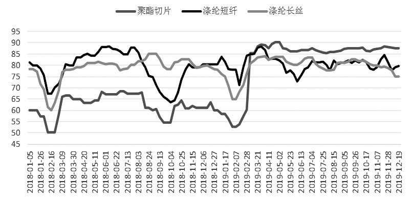 截至12月20日國內(nèi)聚酯裝置停產(chǎn)涉及產(chǎn)能達470萬噸/年。聚酯各品種開工也開始逐漸下降。截至12月19日當(dāng)周國內(nèi)聚酯切片周度開工率87.52%,較2018年同期上升23.88%;滌綸短纖周度開工率79.54%,較2018年同期下降0.86%;滌綸長絲周度開工率75%,較2018年同期下降4%。