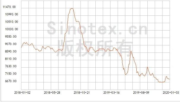 截至2020年1月3日收盤,華東滌綸短纖主流報(bào)盤7000-7300元/噸,主流成交區(qū)間參考6800-7000元/噸。進(jìn)入2020年滌綸短纖價(jià)格仍處2018-2019年同期之下。