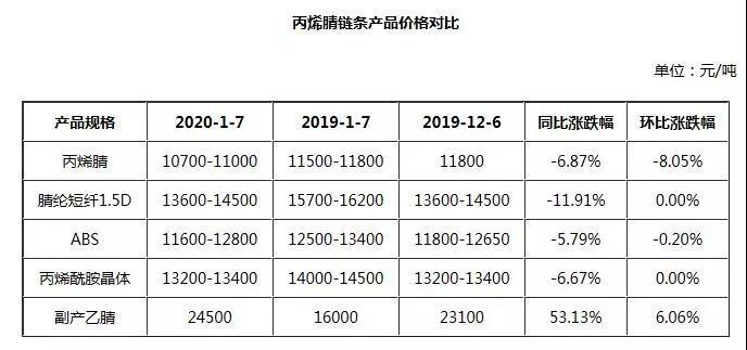 今日2020年,丙烯腈供需格局略變化,安慶石化21萬噸/年檢修裝置逐步重啟,吉林石化3丙12萬噸/年尚未有明確重啟消息,江蘇斯爾邦1條13萬噸/年生產(chǎn)線1月停產(chǎn)檢修10天,丙烯腈整體供應量仍有增多預期,看空氣氛不減,加之本月交易時間較短,中間商持貨信心不足,順勢銷貨為主,截至目前,山東丙烯腈短途送到價格參考10700-11000元/噸,工廠未見銷售壓力。