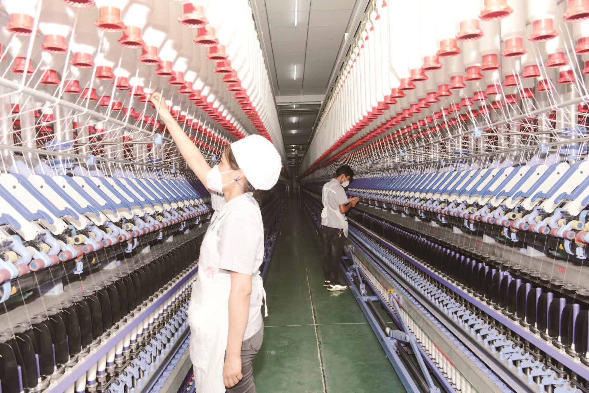 近日,在庫爾勒經(jīng)濟(jì)技術(shù)開發(fā)區(qū),新疆富麗震綸棉紡有限公司紡織工人在生產(chǎn)流水線上作業(yè)。紡織服裝業(yè)是巴州重點(diǎn)產(chǎn)業(yè),面對新冠肺炎疫情帶來的不利影響,各企業(yè)在做好疫情防控措施前提下,保障生產(chǎn),把影響降到最低限度。