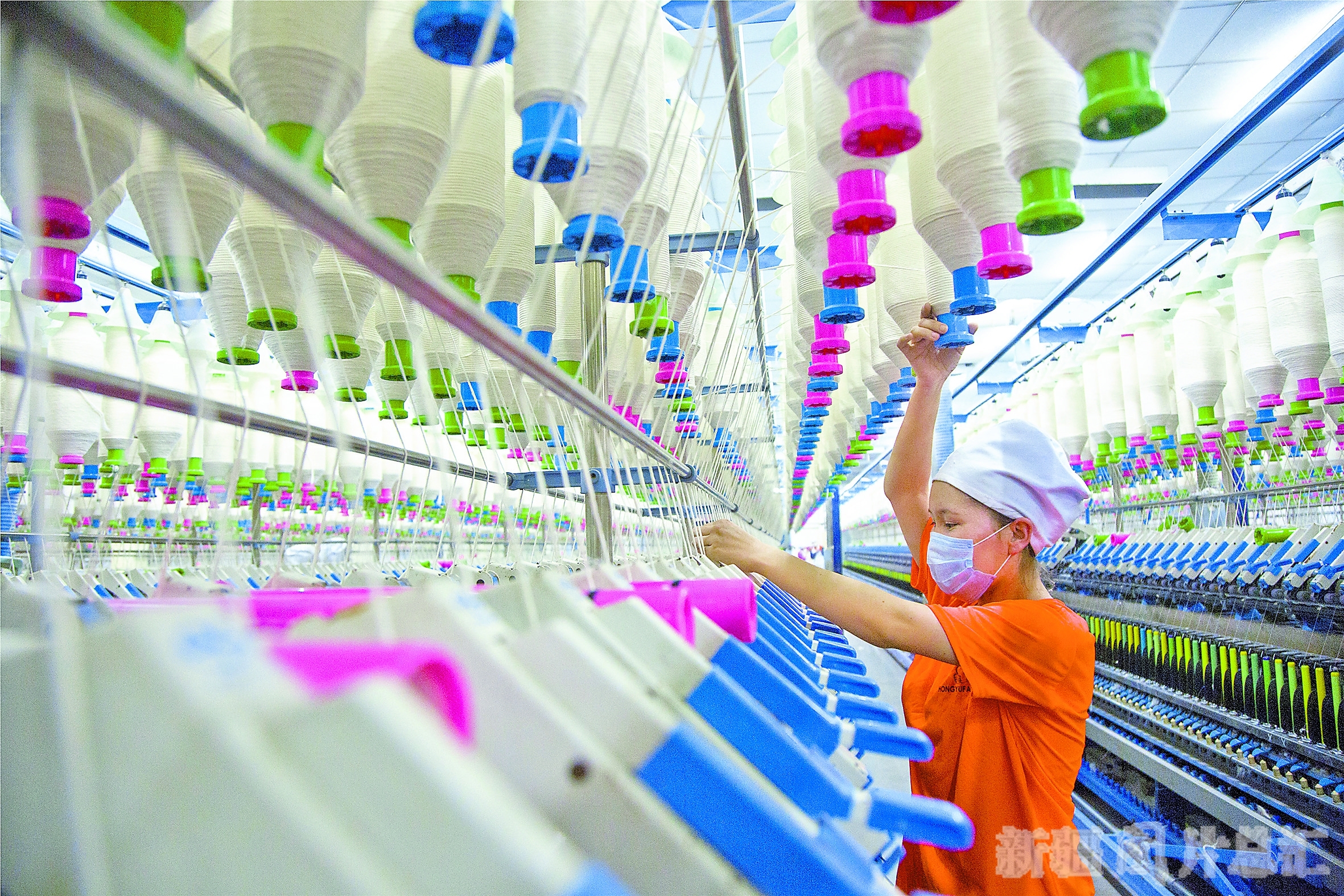 3月17日,工人在精河縣虹宇紡織有限公司紡織車間紡紗。目前,公司開足馬力生產(chǎn)紡織品,保障市場供應(yīng)。