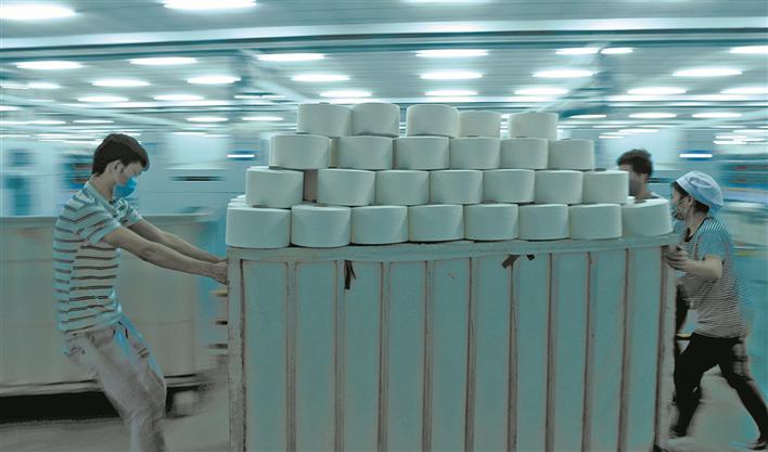 3月17日,新疆新聚豐特種紗業(yè)有限公司員工在拉運(yùn)特種紗制品。