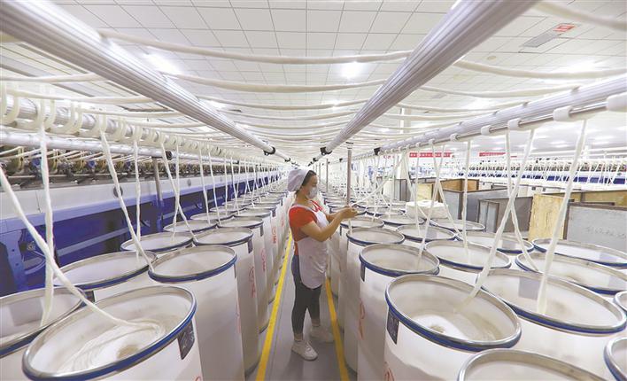 3月16日,位于二師鐵門關經(jīng)濟技術開發(fā)區(qū)的新疆新來福紡織有限責任公司生產(chǎn)車間內,女工在生產(chǎn)線上工作。公司是二師鐵門關市招商引資紡織企業(yè),于3月12日正式復工復產(chǎn),目前正開足馬力為訂單企業(yè)生產(chǎn)棉紗。