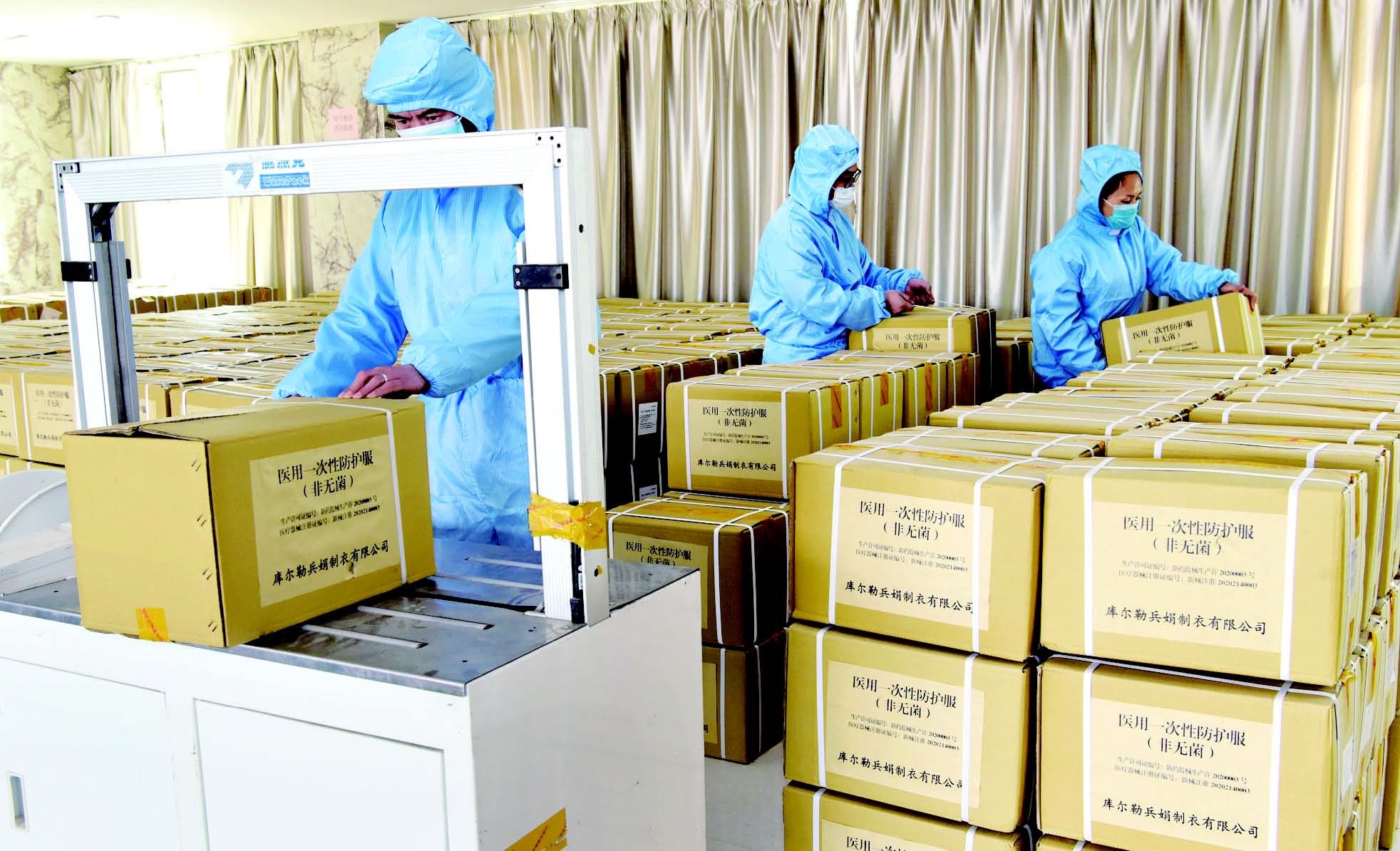 3月24日,在庫爾勒經濟技術開發(fā)區(qū),庫爾勒兵娟制衣有限公司的員工在打包防護服。