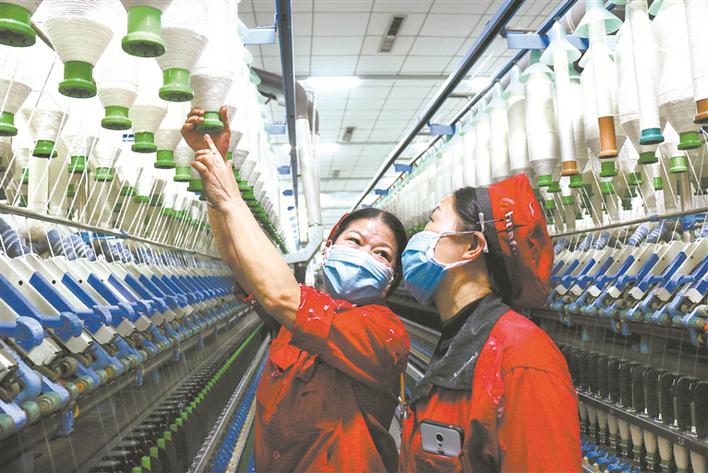 4月1日,在七師新疆華孚紡織有限公司生產(chǎn)車間內(nèi),老員工朱欽敏(左)在指導(dǎo)新員工古力扎提·鎖昆學(xué)技術(shù)。為鞏固脫貧攻堅(jiān)成果,近期七師胡楊河市幫助500多名少數(shù)民族富余勞動力轉(zhuǎn)移就業(yè)。