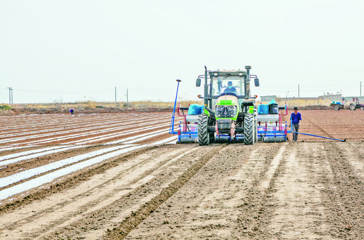 4月9日,溫宿縣共青團(tuán)鎮(zhèn)阿孜干布拉克村農(nóng)民在使用地膜機(jī)為棉花地覆蓋地膜。