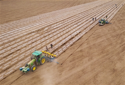 4月10日,昌吉市濱湖鎮(zhèn)下泉子村,何氏農(nóng)機專業(yè)合作社的衛(wèi)星導(dǎo)航無人駕駛拖拉機在地里播種棉花。